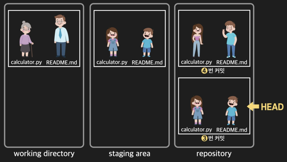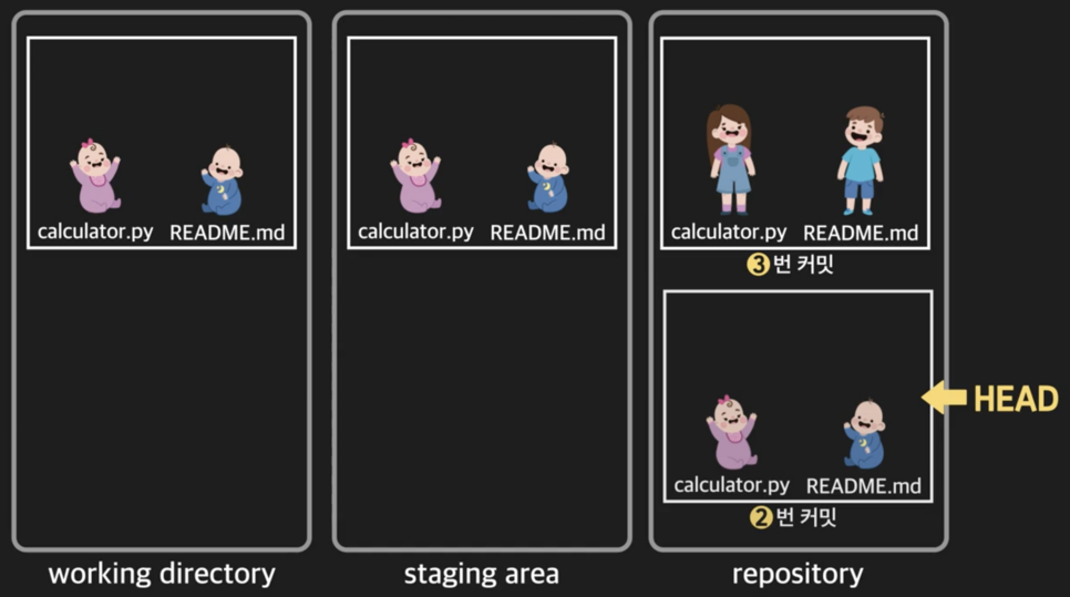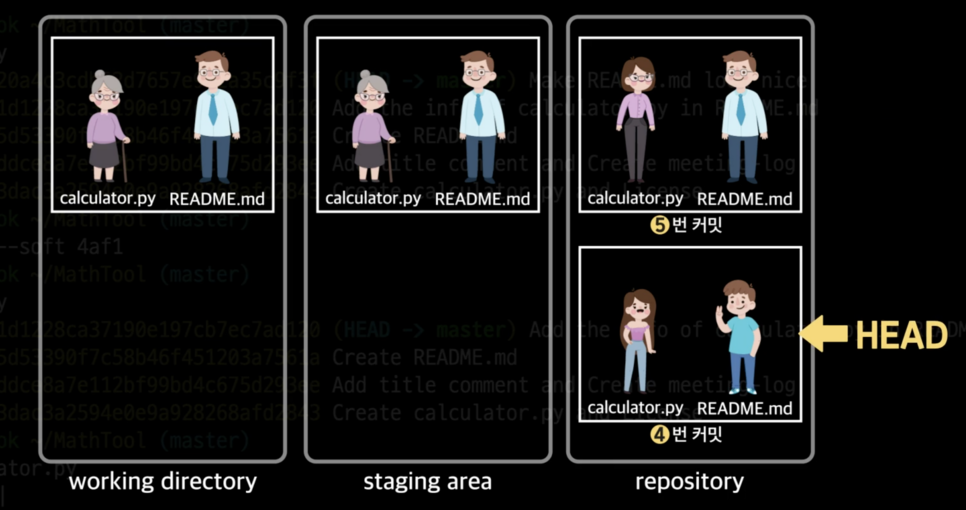 그리고 staging area와 현재 작업 중인 working directory도 해당 커밋의 모습과 동일하게 변함.