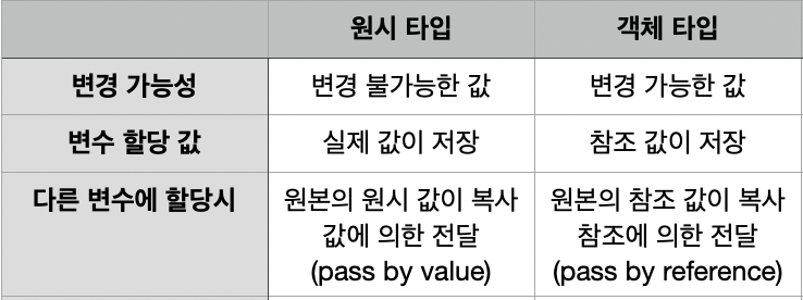 🛑 [원시 타입 - 객체 타입] 은 크게 3가지 측면에서 차이점이 있다.