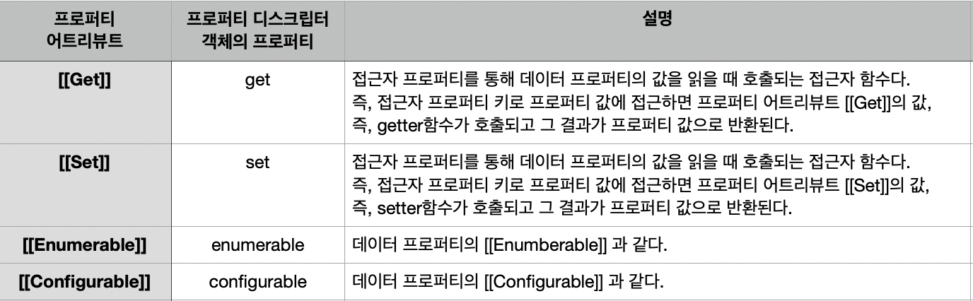 - 접근자 프로퍼티 - 자체적으로는 값을 갖지 않고 다른 데이터 프로퍼티의 값을 읽거나 저장할 때 호출되는 접근자 함수로 구성된 프로퍼티다.