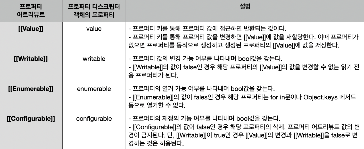 프로퍼티 어트리뷰트는 JS엔진이 관리하는 내부 상태 값인 내부 슬롯( [[Value]], [[Writable]], [[Enumerable]], [[Configurable]])이다.