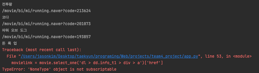 영화를 크롤링해오는 프로젝트를 진행하던 중에 TypeError:'nonetype' object is not subscriptable 에러를. 만났다.