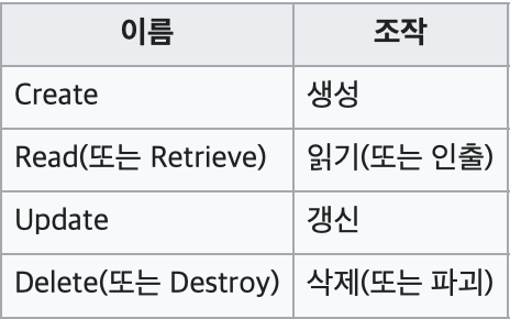 기본적인 데이터 처리기능인 Create(생성), Read(조회), Update(수정, 갱신), Delete(삭제)를 묶어서 일컫는 말이다.