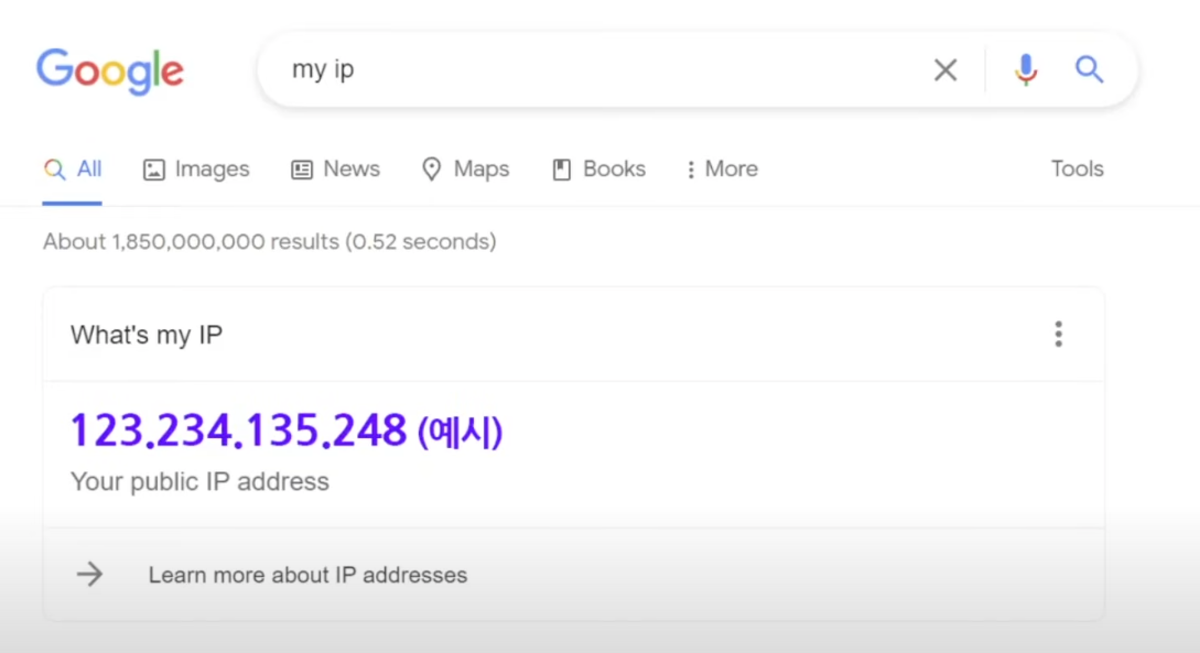 라고 검색해보시면 '000.000.000.000' 형태의 주소를 확인할 수 있습니다.