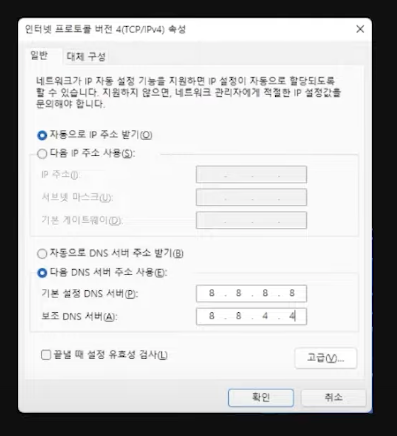 예를 들어 윈도우에서 이처럼 기본 DNS를 구글 DNS 서버 주소인 8.8.8.8로 설정하면