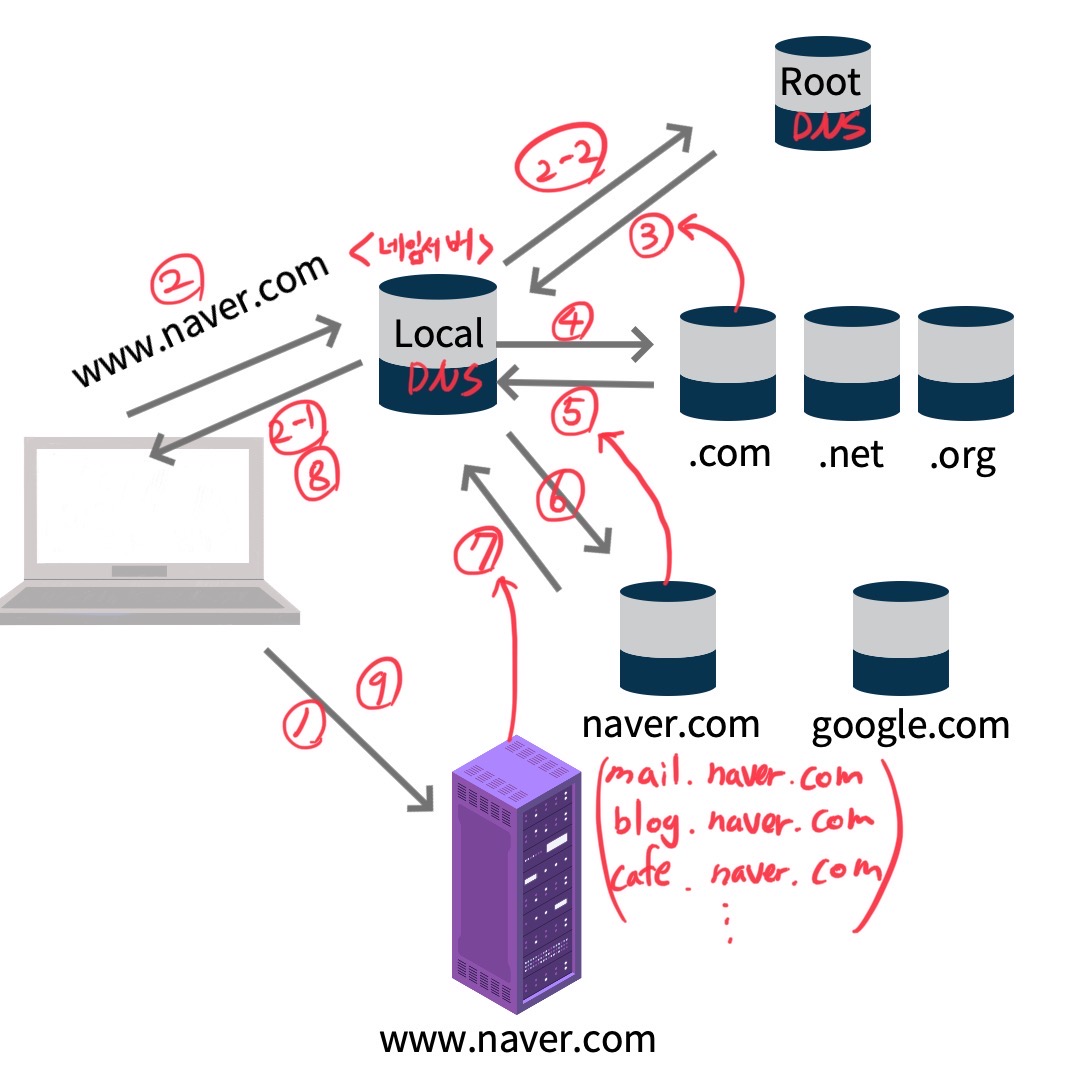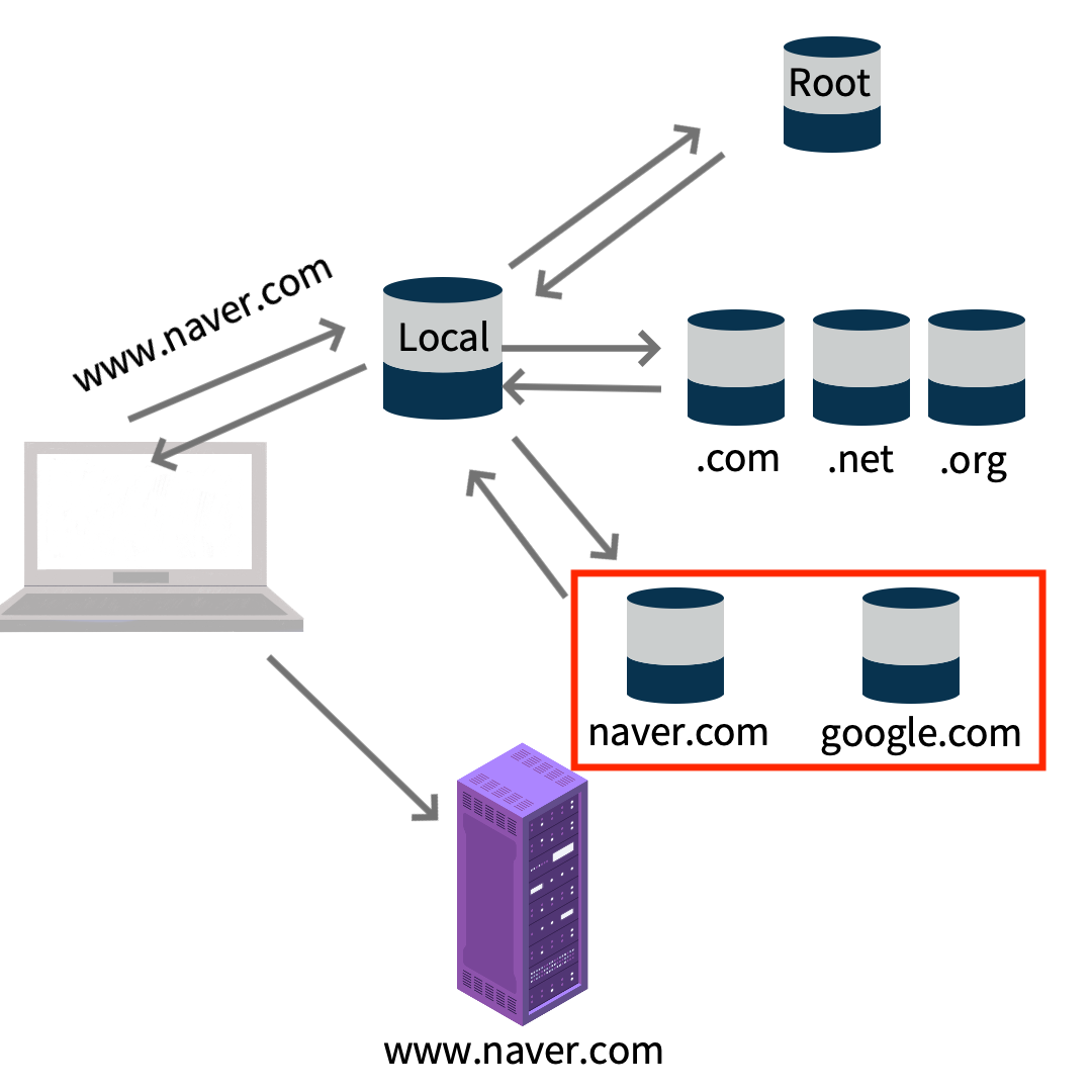 <Local>1)내 컴퓨터에서 www.naver.com에 접속하려고 합니다. 그런데 현재 내 브라우저는 이 서버의 IP를 모릅니다.2)브라우저는 PC에 설정된 로컬 DNS 서버에 해당 도메인과 호스트명의 IP를 갖고 있는지 물어봅니다.DNS 서버는 네임서버라고 부르기도 하고, 보통 통신사마다 지정된 곳이 있습니다. 하지만 사용자가 다른 곳으로 바꿀 수도 있습니다.이 DNS 서버에는 해당 주소의 정보가 캐싱되어 있을 수도 있고, 없을 수도 있습니다.