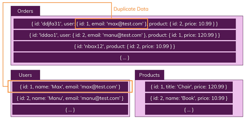 따라서 많은 Orders(주문한 제품)이 있을 경우, 일반적인 정보를 모두 포함한 데이터를 Orders컬렉션에 저장합니다.
