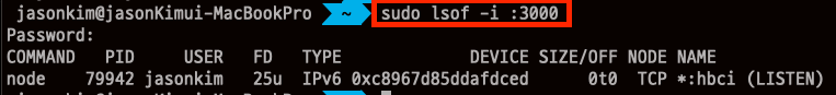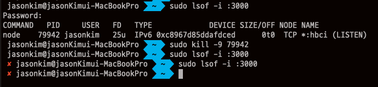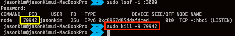 'sudo kill -9 PID 번호'에 추가하여 명령어를 입력한다.